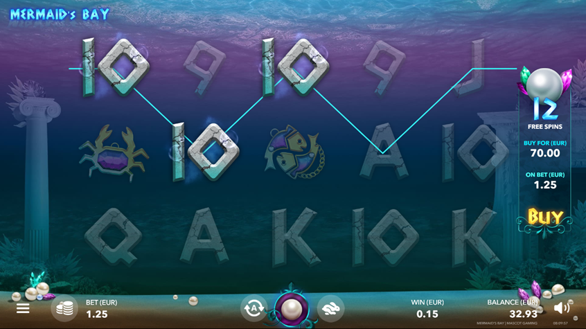 The Expanding Mermaids in Mermaid’s Bay award Free Respins on a 5x3 reel grid. This mermaid slot game from Mascot Games has 2 types of Wild symbols: a Blonde and a Brunette Mermaid. There is a Wild Transformation symbol to increase wins and a Scatter symbol which awards up to 25 Free Spins. Mermaid’s Bay has a Bonus Buy feature, which allows you to buy Free Spins so you can play them instantly.