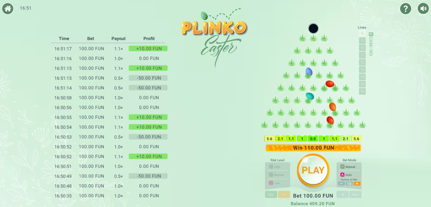 Watch your Easter Eggs bounce down the magical Easter tree in Easter Plinko from the gaming provider, Bgaming, to bring you some tasty Easter Plinko wins. Adjust the levels and risk level and see if you can claim the grand x1000 multiplier! Gruff!