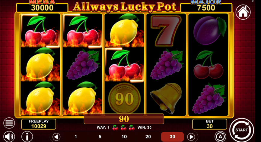 • Play Mode - Allways Lucky Pot is a 5x3 reel video slot game with 243 paylines, Fruit, Sevens, and Bell symbols, an Allways feature, and a Lucky Jackpot.