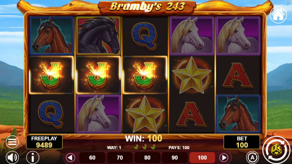 • Play Mode – Brumby’s 243 is a 5x3 reel video slot game with 243 paylines and Maximum Multiplier x2500, Scatter symbol, Multiplier x2, and Bonus Spins.