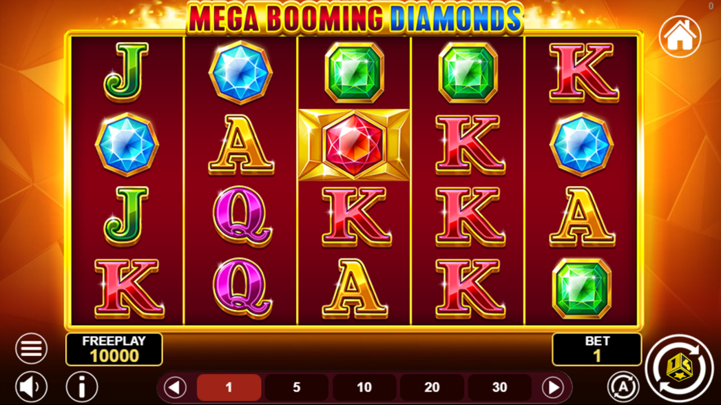 Mega Booming Diamonds has a maximum multiplier of up to x4500 and the classic sound effects will get you in the winning mood. The gems glitter appealingly and makes playing Mega Booming Diamonds a feast of gems and cards on the 5x4 reel grid. The RTP of 97.2% will herald some striking winning combinations. Set the Mega Booming Diamonds to Autospin, with options to play an unlimited amount of spins. The 1024 paylines will bring in big rewards when you play this slot game from 1spin4win.