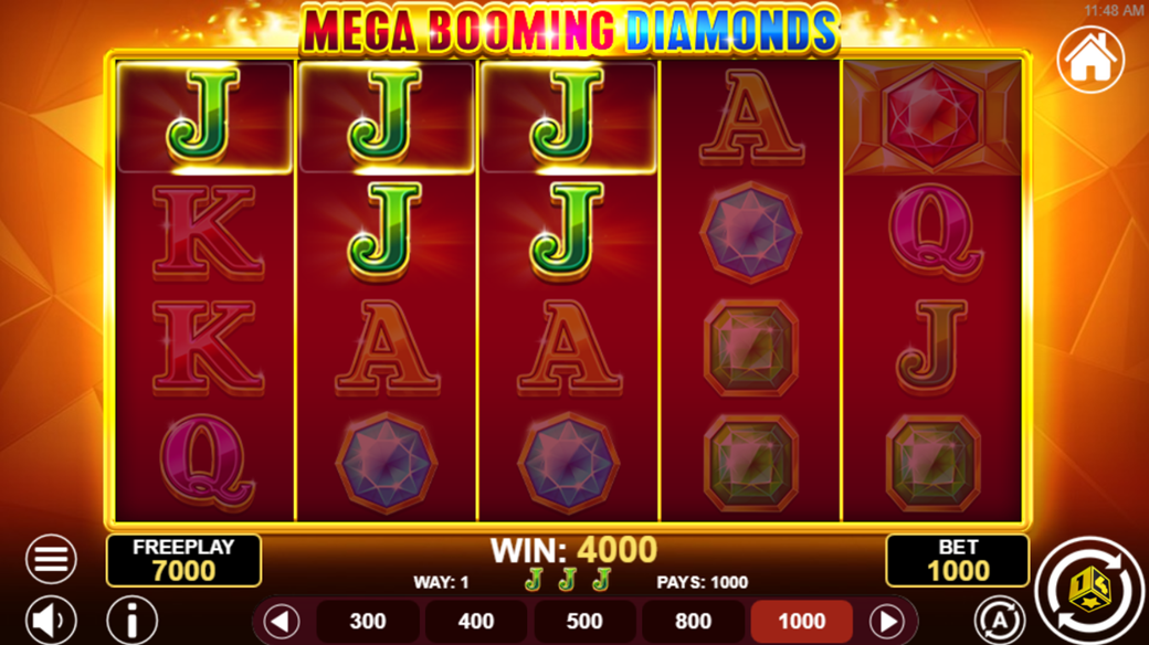 Mega Booming Diamonds from 1spin4win is a classic retro slot game with a maximum win of up to x4500 and an RTP of 97.2%. The classic sound effects are reminiscent of casino halls of the past, and the smooth animations, along with the remarkable 1024 paylines make playing this slot game rewarding. Mega Booming Diamonds can be played for a minimum bet of 0.01 to start the reels spinning. The 5x4 grid in Mega Booming Diamonds provides excellent gameplay with substantial payouts.