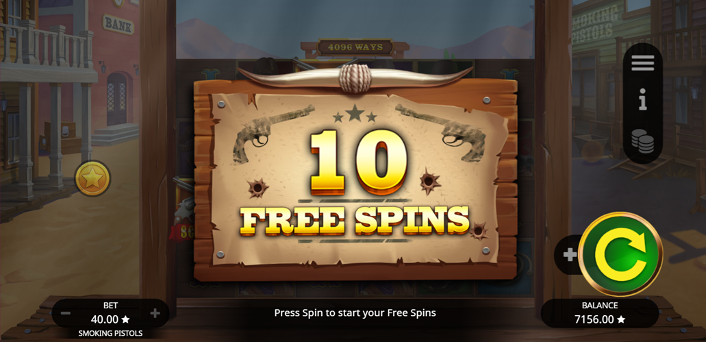 • Free Spins – 3, 4, 5, or 6 Pistols Scatter symbols activate 10, 15, 20, or 25 Free Spins. Free Spins can be retriggered.