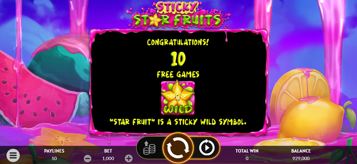- Play Mode - Sticky Star Fruits is a 5x3 reel video slot game with 10 paylines, Star Fruit Wild and Juicer Scatter symbols, Free Games, and a Buy Feature.