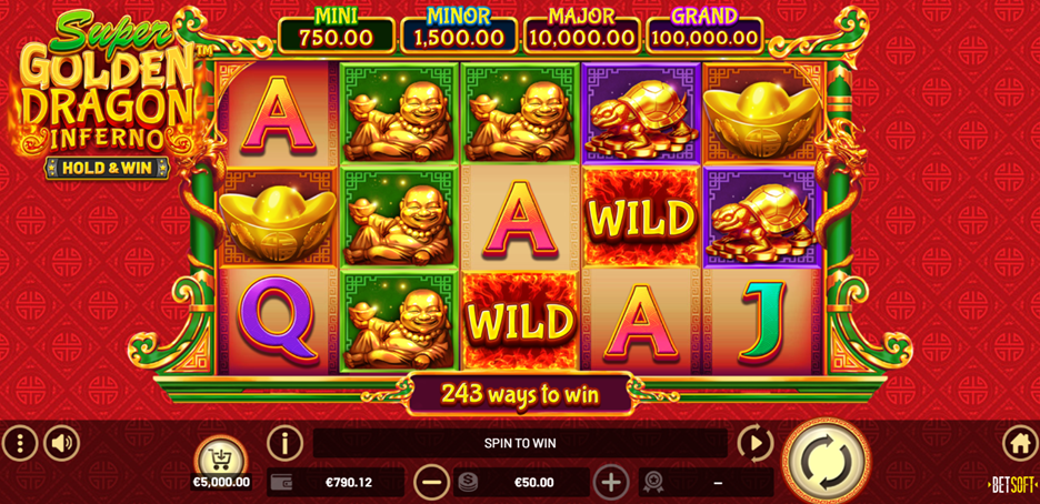 - Play Mode – Super Golden Dragon Inferno is a 5 reel video slot game with 243 paylines, Wild, Random Wilds, and Bonus symbols, Nudging Multiplier Wild Reel, Stacked Mystery Symbol, Jackpots, Hold ‘n’ Win Bonus, and Buy Features.