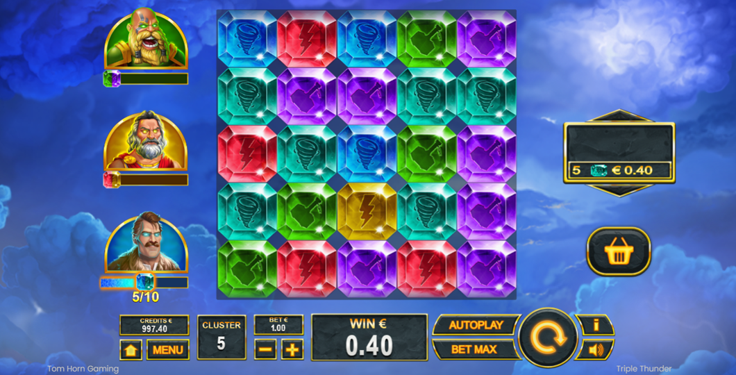 • Play Mode - Triple Thunder is a 5x5 reel video slot game with cluster paylines, Scatter Symbols, Shatter Mode, Thunder Collection, Thunder Meter, Free Spins, and a Buy Feature.