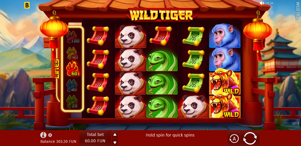 • Wild Tiger graphics – Infused with Oriental music and lively animations of snakes, monkeys, pandas, and the Wild Tiger, these graphics are designed to thrill you into big wins.