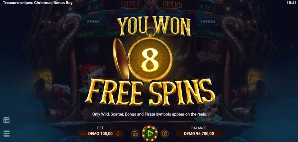 - Play Mode - Treasure-Snipes: Christmas Bonus Buy is a 5x3 reel video slot game with 20 paylines and Free Spins, Bonus Game, and Mini, Mega, and Super Jackpots.