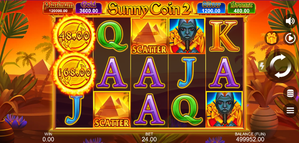 - Egyptian graphics – Sunny Coin 2: Hold the Spin sports an Egyptian theme with Sphinx, Cats, Pyramids, Golden Horses, and mystical music to ching your way to wins.