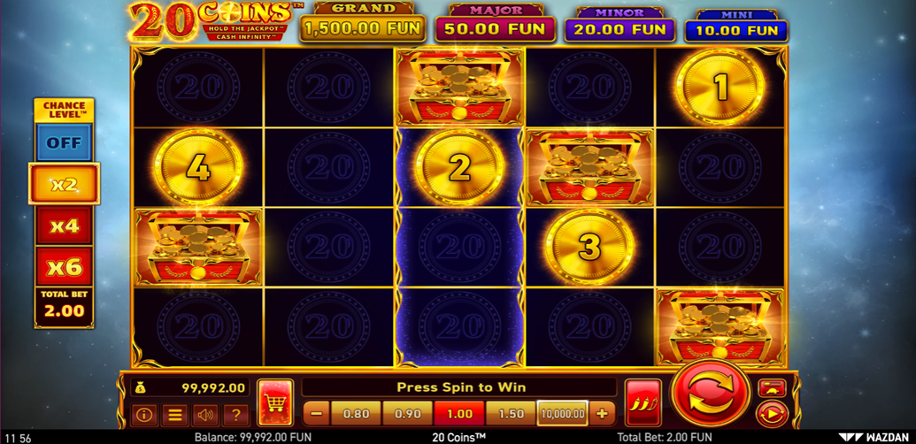 - Play Mode - 20 Coins™ is a 5x4 reel video slot game with 20 paylines, Unique Gamble Feature, Sticky to Infinity™, Volatility Levels™, Buy Feature, Hold The Jackpot™, Cash Infinity™, and Chance Levels.