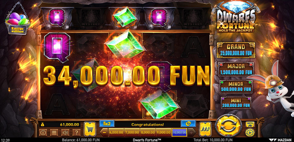 - Play Mode - Dwarfs Fortune™ Easter is a 5x3 reel video slot game with a fourth-row overhead, 20 paylines, Unique Gamble Feature, Hold The Jackpot™, Increasing Value Stick Cash symbol, Adjustable Volatility Levels, and a Buy Feature.