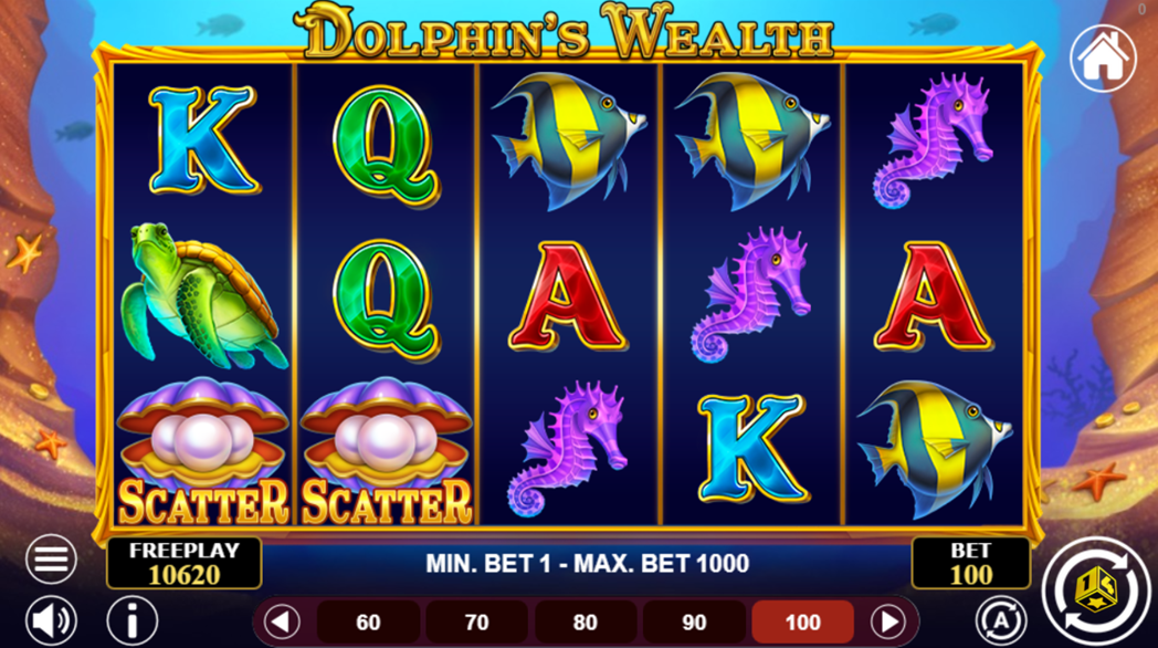 - Play Mode – Dolphin's Wealth is a 5x3 reel video slot game with 243 paylines, Oyster Scatter and Pearl symbols, and Free Spins.