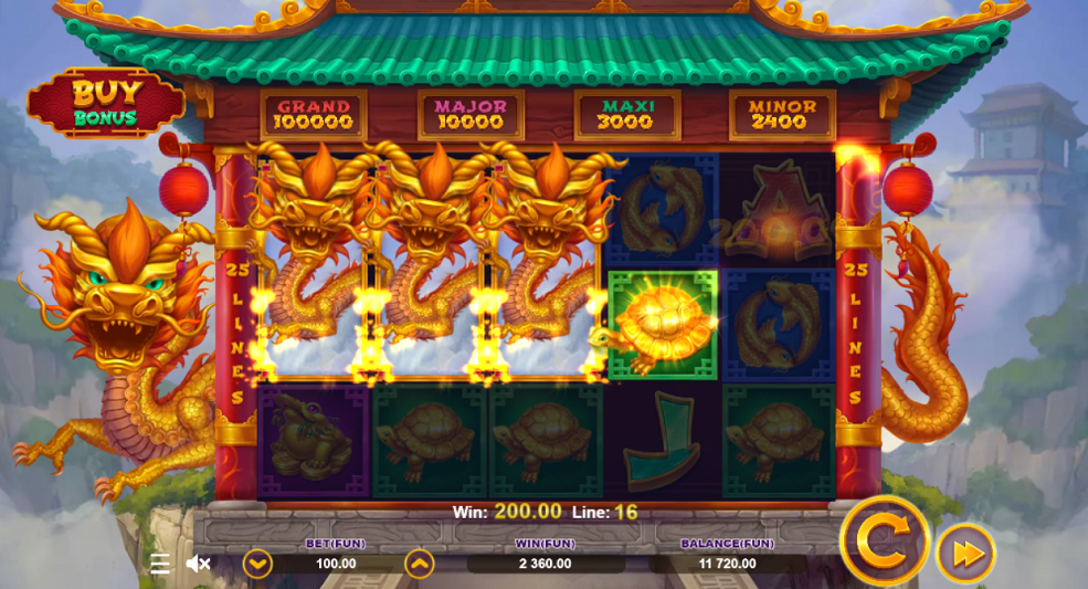 - Dragon graphics – Dive deep into the magical realm with the shiny Golden Dragon flaunting his menacing smile in brilliant 3D. Stay immersed with symbols like Fish, Turtle, Frog, Pots of Gold, and Golden Coins, all complemented by the enchanting oriental background music.