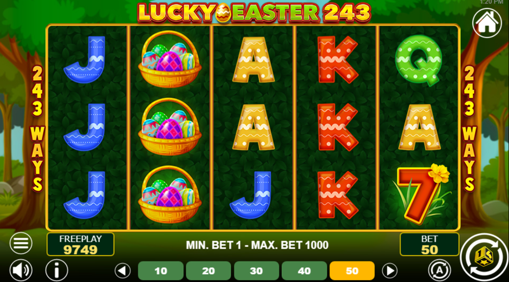 - Minimum and maximum bet – Lucky Easter 243 has a minimum bet of 1.00 and 1000.00 as a maximum bet.