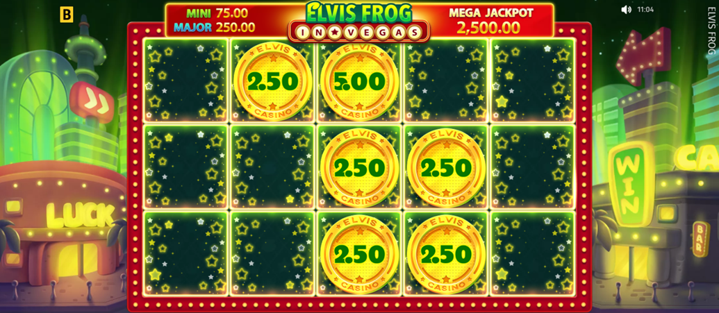- Minimum and maximum bet - Elvis Frog in Vegas has a minimum bet of 2.50 and 25.00 as a maximum bet.