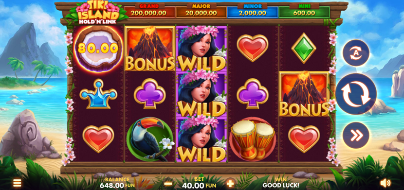 • Play Mode - Tiki Island: Hold ‘n’ Link is a 3x5 reel video slot game with 50 paylines, Stacked Wilds, Free Spins, Hold ‘n’ Link, and Jackpot features.