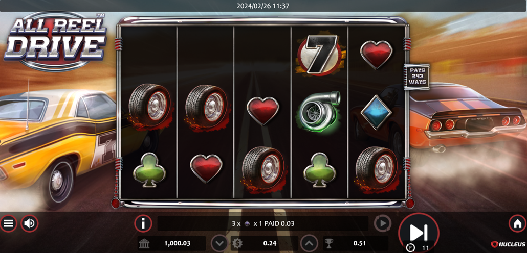 Get caught up in the exhaust fumes and excitement when you get into All Reel Drive and press your pedal to the metal in this Formula 1 slot game from Nucleus Gaming offering 243 pay lines, Free Spins, Exploding Free Spins, and a Bonus Buy Coin. All Reel Drive is designed to rev your gaming engine and give you pleasurable high-speed wins. Purr!